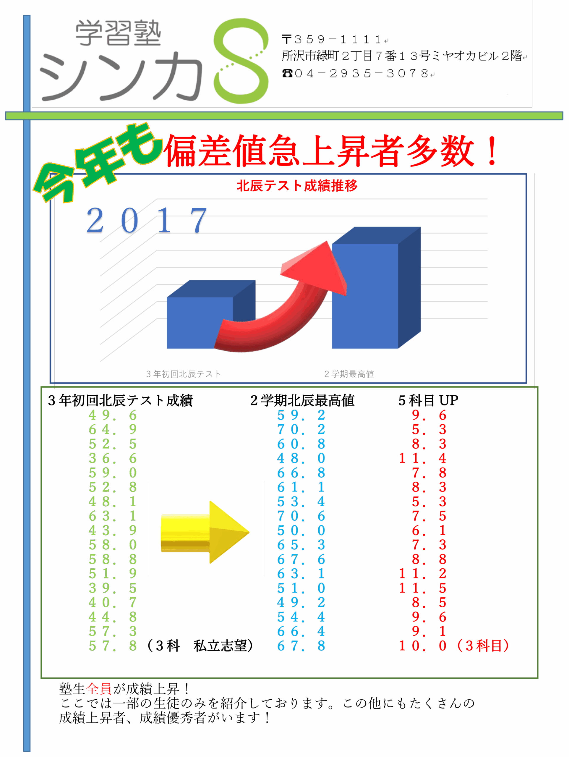 過去には通知表の成績が中1,中2ともに合計29(45点満点)の子が川越高校に合格しています。